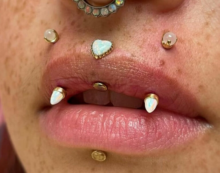 Le piercing Angel Bite est un labret vertical, placé en symétrie sur la lèvre du haut.